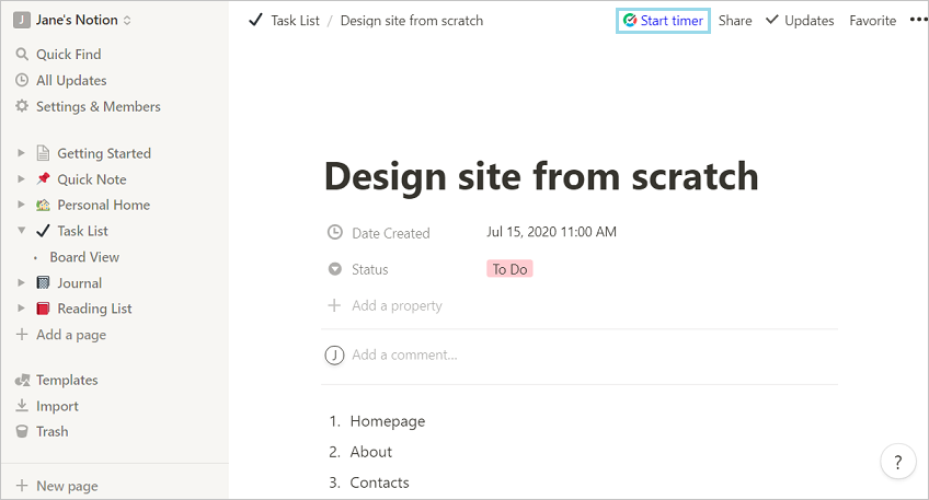 Summoned straight from the browser extension, that not only starts the clock but also quietly harvests the page title, database properties, and even the exact block you’re editing, so every minute is automatically linked to the right Notion task without you ever leaving the page.