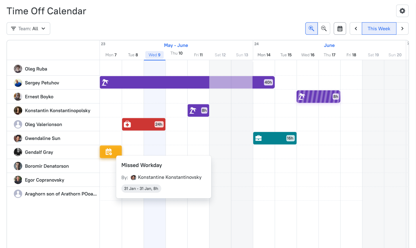 Employees request vacation or sick days inside the same interface they already use for time tracking, and balance accrual rules (by tenure, location, or role) update in real time. Approved PTO blocks automatically appear on the team planner, preventing accidental task assignment while feeding accurate capacity forecasts to the project scheduler.