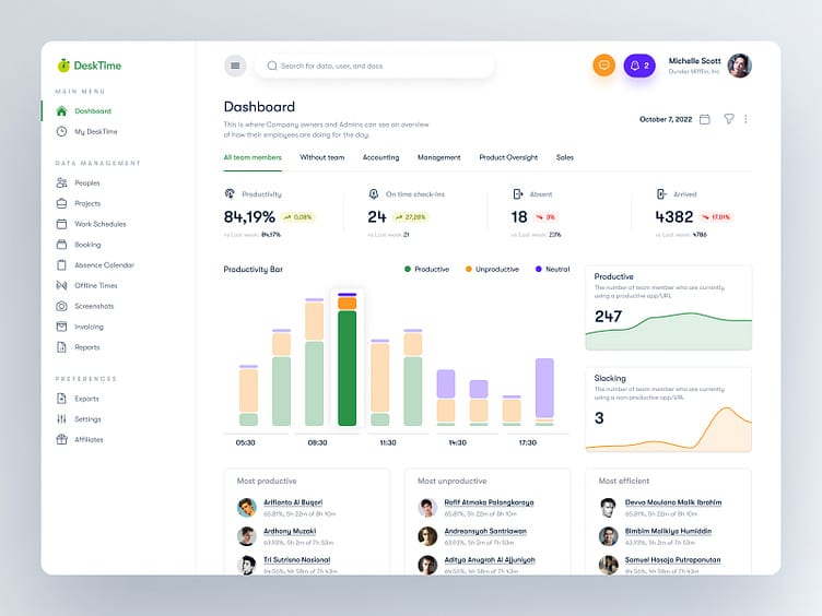 - Productivity pulse score – daily/weekly ratings based on your activity patterns