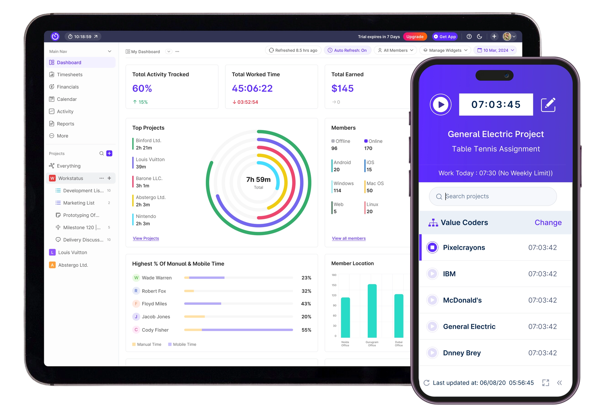WorkStatus works for managers who want real-time visibility into remote and field staff through GPS, screenshots, and productivity scores. Employees get a hassle-free one-button clock-in that respects geofenced job sites.