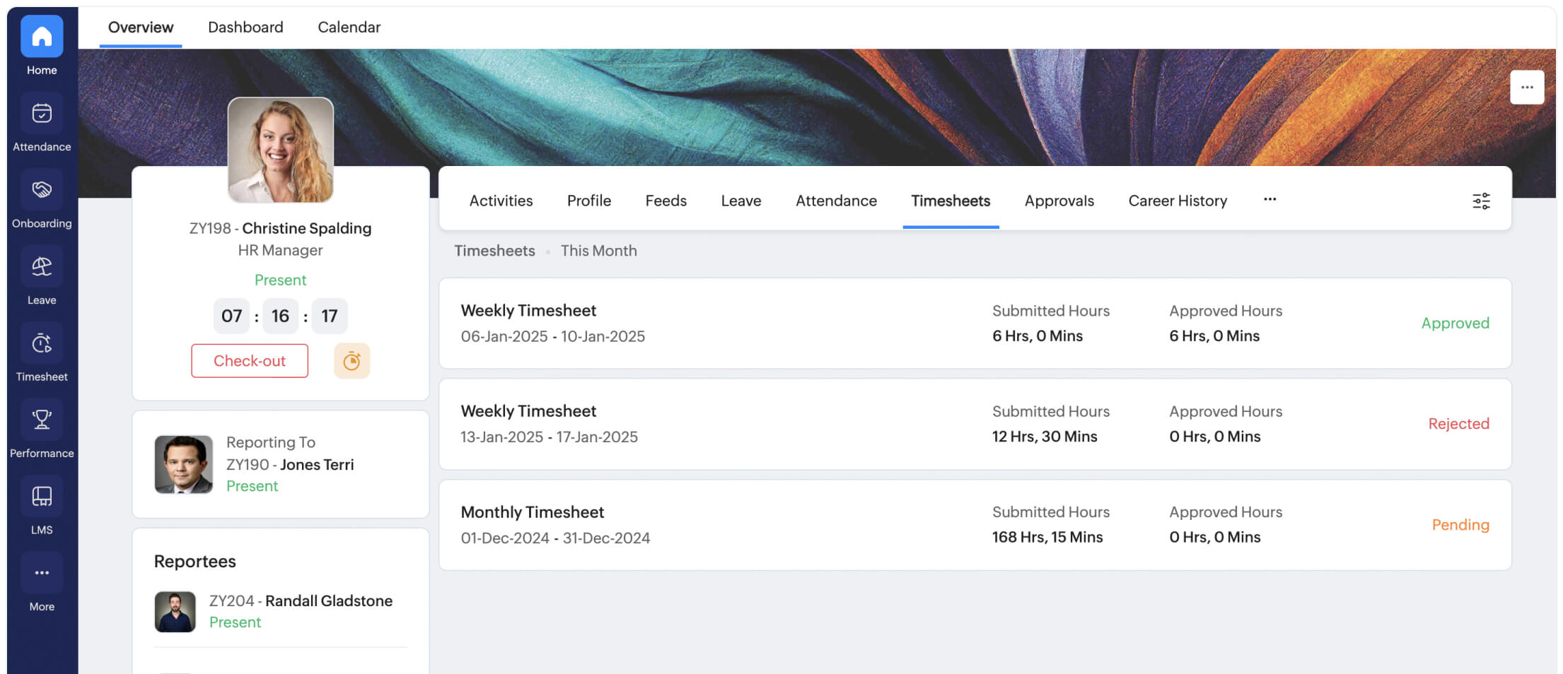 Zoho People wraps time tracking inside a broader HRIS, letting employees log hours against projects while HR simultaneously manages leave, performance, and OKRs. The result is a single employee record from hire to timesheet approval.
